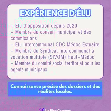Pour celles et ceux qui me découvrent, je vis et travaille au Pian Médoc depuis 2010. Elu d'opposition depuis 2020, j'ai une solide expérience des dossiers de la commune et des relations intercommunales.