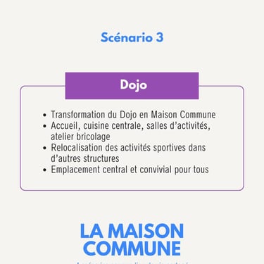 Aménager le Dojo en Maison Commune avec espaces accueil, cuisine, salles d’activités et atelier, tout en prévoyant de reloger les activités sportives ailleurs.